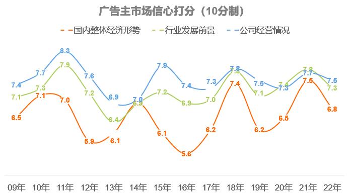 ●《2022中國(guó)廣告主營(yíng)銷(xiāo)趨勢(shì)調(diào)查》報(bào)告(以下簡(jiǎn)稱(chēng)報(bào)告)顯示,2022年受疫情反復(fù)、行業(yè)變革等國(guó)內(nèi)外復(fù)雜環(huán)境影響,廣告主的信心指數(shù)(廣告主針對(duì)國(guó)內(nèi)整體經(jīng)濟(jì)形勢(shì)、行業(yè)發(fā)展前景、公司經(jīng)營(yíng)情況的信心打分)相對(duì)于2021年有所回落,但仍高于2020年的疫情之初。