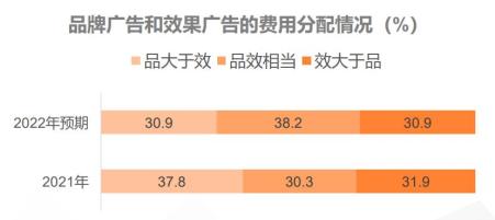 ● 報(bào)告顯示,2021年廣告主將52.5%預(yù)算用于品牌廣告、47.5%用于效果廣告。而在2022年,廣告主品效預(yù)算占比的差額進(jìn)一步收窄,分配預(yù)期更加均衡。
