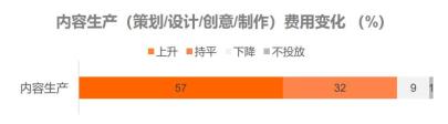 ● 媒體廣告、內(nèi)容營(yíng)銷(xiāo)、私域運(yùn)營(yíng)、行業(yè)公關(guān)等所有營(yíng)銷(xiāo)行為,都需要內(nèi)容填充。隨著算法極大縮短了內(nèi)容傳播的周期,廣告主對(duì)內(nèi)容的需求會(huì)呈現(xiàn)冪次增長(zhǎng),內(nèi)容生產(chǎn)和產(chǎn)品生產(chǎn)一樣,成為企業(yè)的重投入。報(bào)告顯示,57%的被訪(fǎng)廣告主在2022年增加內(nèi)容生產(chǎn)的費(fèi)用投入。