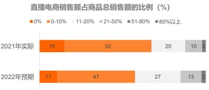 ● 報(bào)告顯示,2021年半數(shù)廣告主表示,直播電商渠道的商品銷(xiāo)售額占總銷(xiāo)售額的比例在0-10%的區(qū)間,多數(shù)廣告主預(yù)期2022年會(huì)有所上漲。