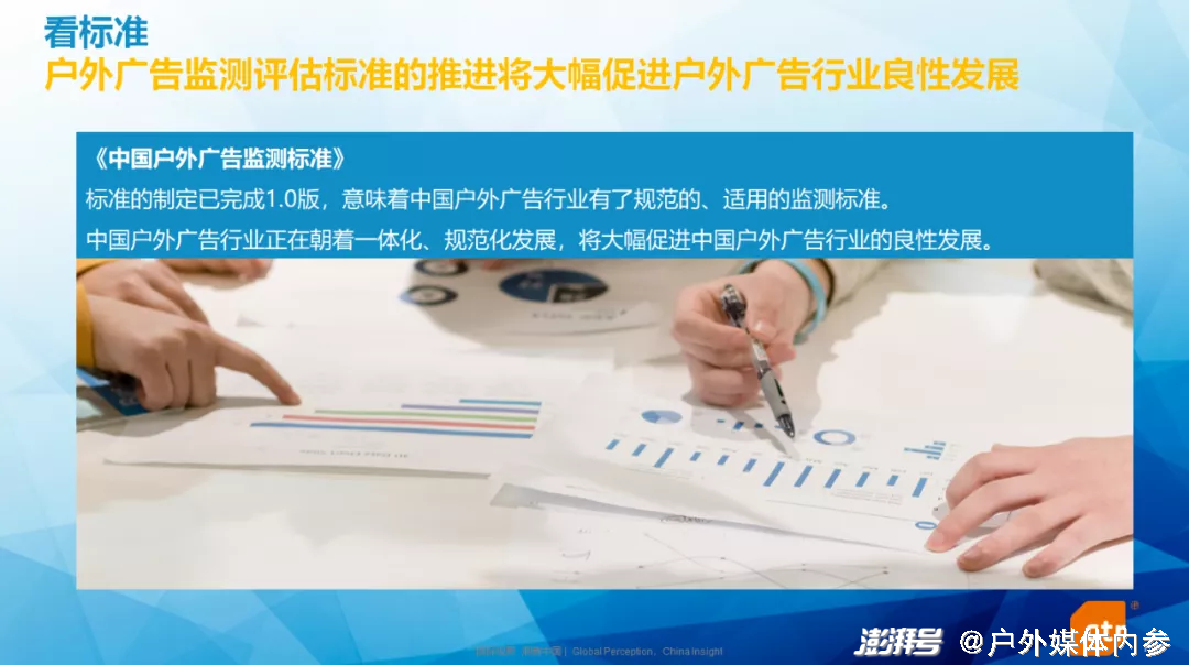 這一標(biāo)準(zhǔn)的發(fā)布,對戶外廣告行業(yè)有著歷史性的意義。長期以來,戶外廣告的監(jiān)測一直是短板,因為缺少相關(guān)的數(shù)據(jù),廣告主無法保障戶外媒體投放的權(quán)益和效果。而戶外廣告公司為了滿足廣告主的需求,也希望找到有效監(jiān)測和評估的系統(tǒng)?;谝陨锨闆r,《中國戶外廣告監(jiān)測標(biāo)準(zhǔn)1.0》建立科學(xué)、規(guī)范、適用的戶外廣告監(jiān)測標(biāo)準(zhǔn),有利于保障廣告主投放權(quán)益,有利于促進市場參與方實現(xiàn)共贏,有利于推動和建設(shè)健康的戶外媒體商業(yè)環(huán)境,有利于實現(xiàn)戶外媒體行業(yè)有序、健康、可持續(xù)發(fā)展。