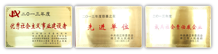 企業(yè)慈善義舉得到社會(huì)肯定,榮獲靖江市“優(yōu)秀社會(huì)主義建設(shè)者”、“慈善之星先進(jìn)單位”、“最具社會(huì)責(zé)任感企業(yè)”